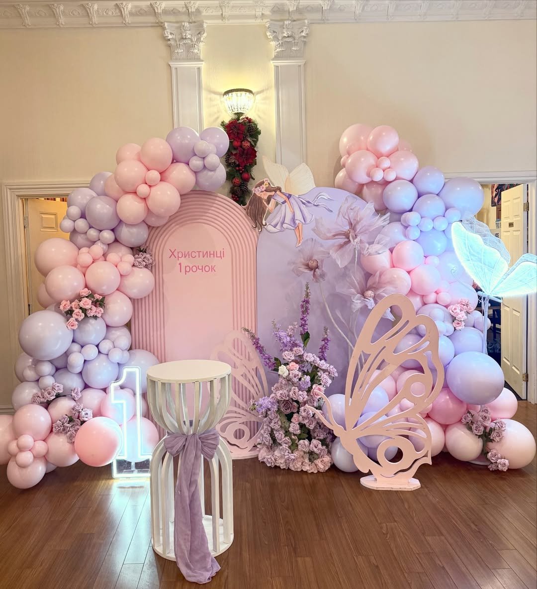 This one almost feels like stepping into a tiny butterfly fairy forest. Giant glowing butterfly wings rise from a sea of pastel balloons and tulle flowers, casting a soft glow across the whole scene.
