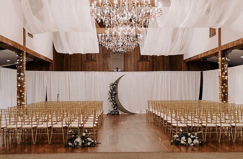 A crescent moon altar steals the spotlight in this dreamy indoor ceremony. Golden chiavari chairs line the polished wood aisle, framed by scattered florals and soft white draping. Overhead, chandeliers sparkle beneath billowing fabric, giving the space a weightless, starlit feel.