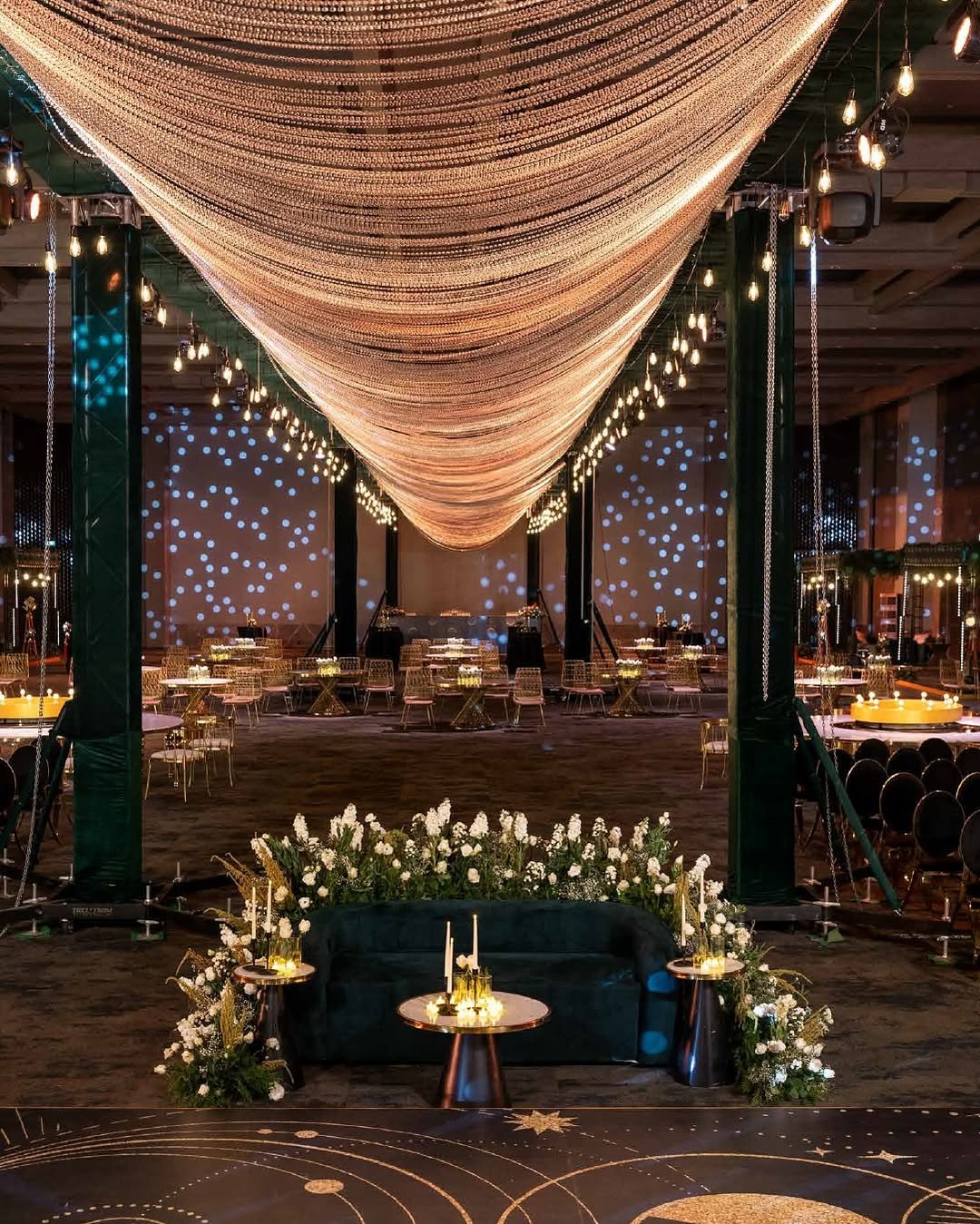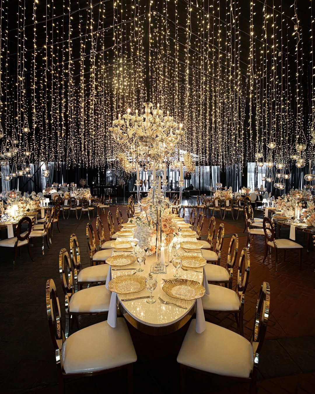 This moody, starlit reception feels like stepping into a galaxy of gold. Thousands of strings of warm-toned lights cascade from above like a cosmic waterfall, creating a soft celestial canopy that dances above the space.