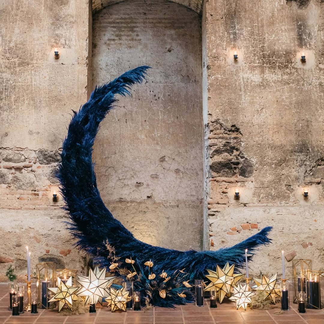 At the base, a constellation of golden star lanterns and black candles glimmer like quiet beacons. It’s a modern altar for moonlit vows, where the universe itself feels like a witness.