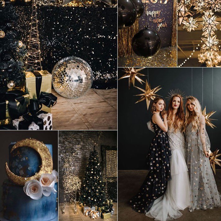 A shimmering ode to the stars, this New Year’s Eve palette captures cosmic elegance with every detail. Midnight black, moonlit gold, and celestial sparkle dance across gowns, disco balls, and dreamy tablescapes.