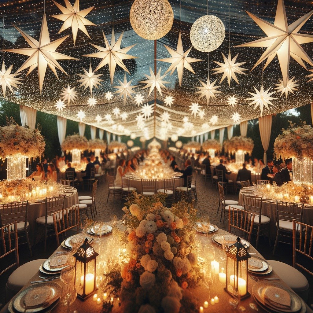 This starlit reception feels like a dream woven from moonlight. A canopy of glowing paper stars and orbs hovers above, casting golden light that dances across the tables.