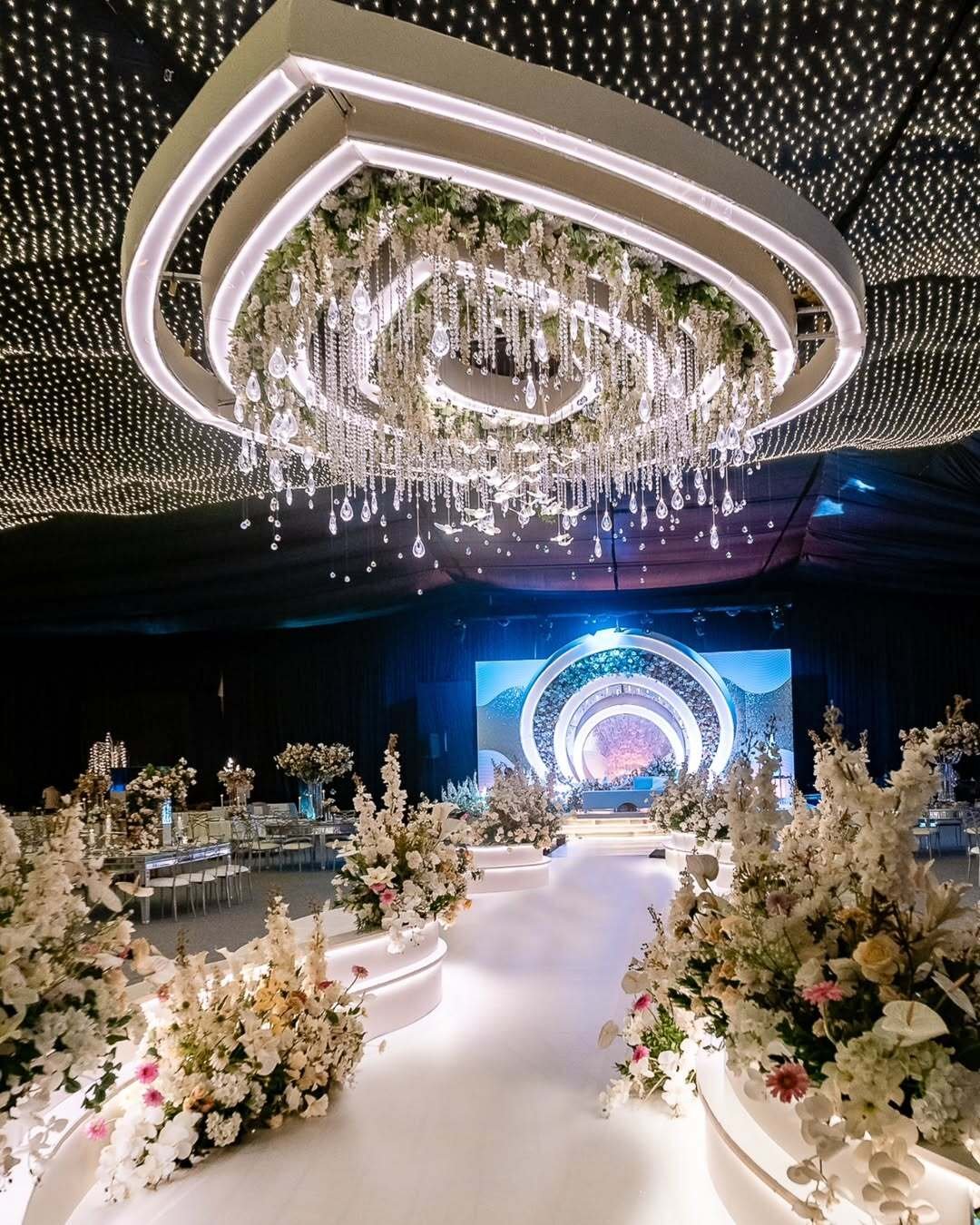 This setup feels like stepping into a modern fairytale. Cascading chandeliers drip with crystals and soft blooms, mirroring the winding, luminous aisle below.