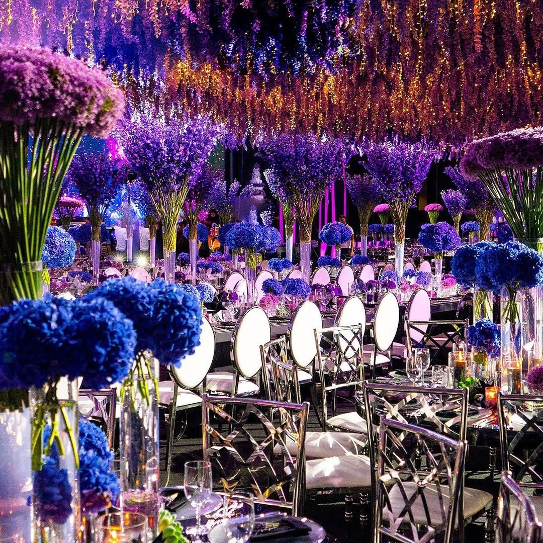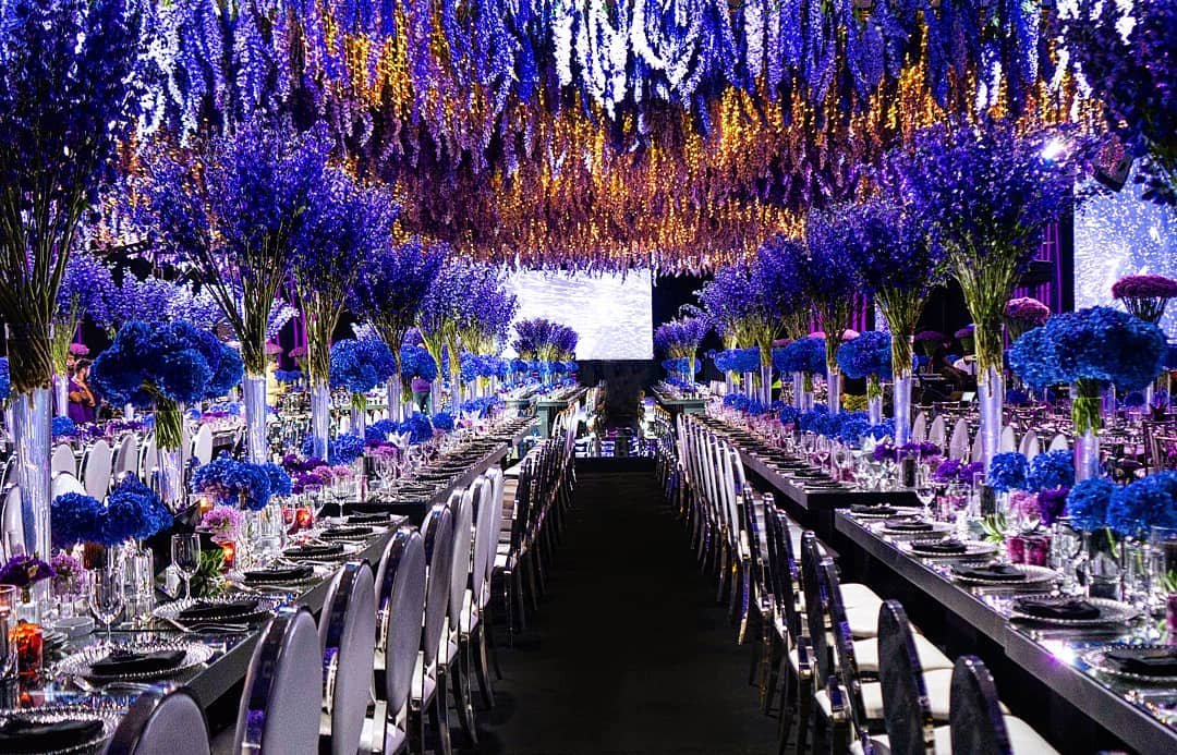 It’s luxe, it’s lush, and it’s a masterclass in maximal floral fantasy. Every detail whispers opulence — from the crystal-clear vases to the deep purple lighting that makes the whole room feel like it bloomed at midnight.