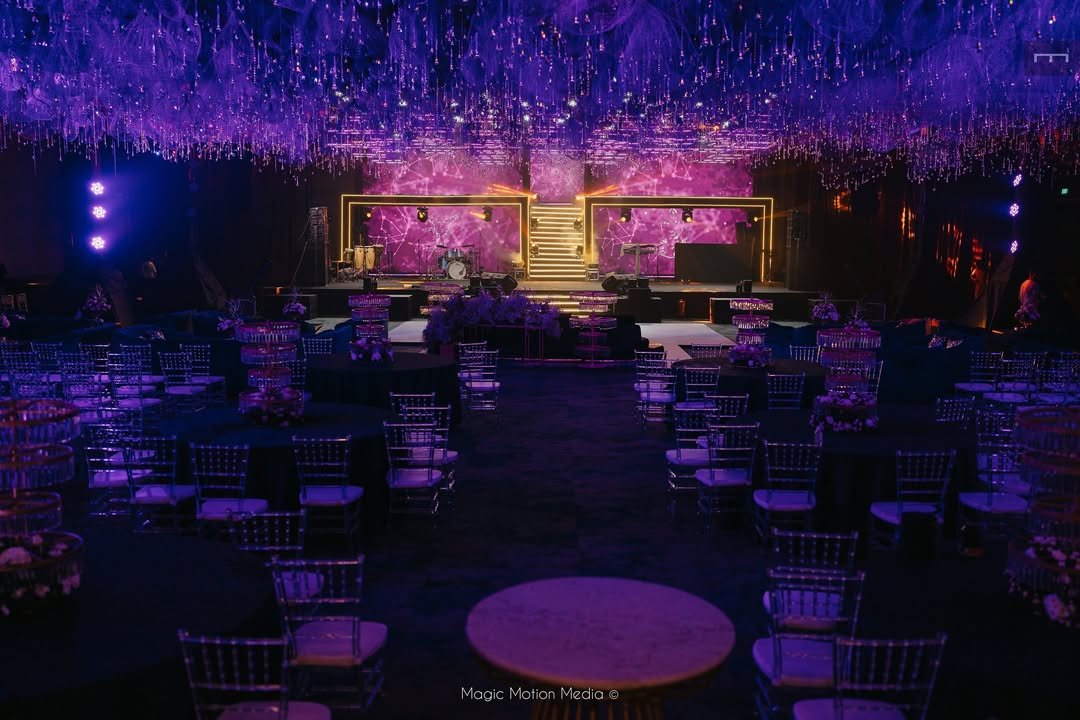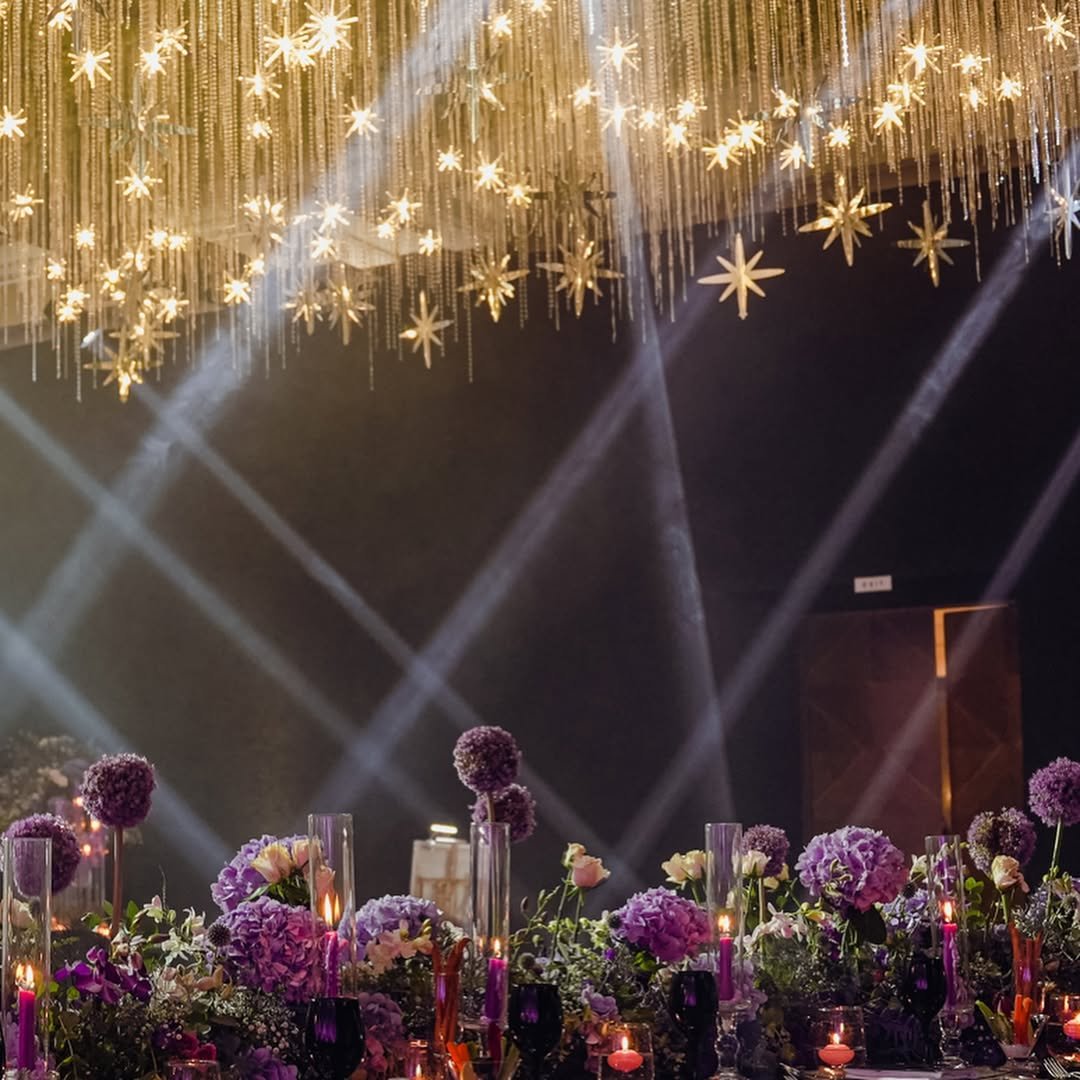 A dazzling wash of amethyst and ultraviolet gives this event a bold, almost cinematic energy. The illuminated ceiling—draped with crystal strands and violet light—feels like a galaxy unfolding overhead.
