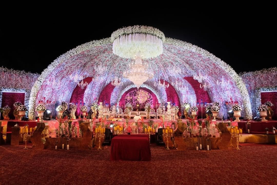Golden decor, sculptural vases, and towering centerpieces make the space feel like a royal banquet wrapped in a garden of dreams. It’s theatrical, luxurious, and utterly unforgettable.