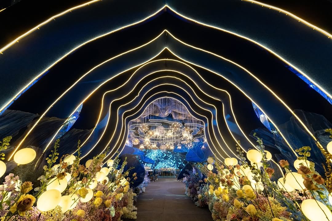 Stepping into this wedding is like wandering through a portal to another world. Arched neon-lit tunnels ripple overhead, guiding guests through a cosmic corridor lined with glowing orbs and wild florals.