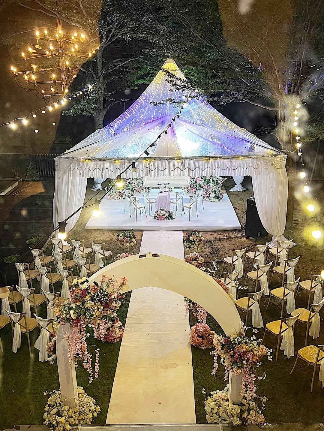 Nestled beneath a glowing canopy of string lights and stars, this wedding setup feels like something out of a dreamy forest fairytale. The translucent tent sparkles with soft lilac and golden light, creating a magical, intimate glow.