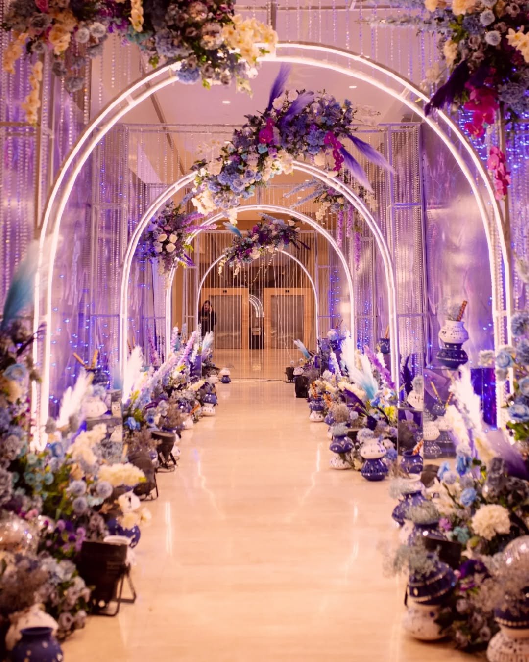 A corridor kissed by moonlight — this glowing tunnel feels like a passage between worlds. Arched in soft white light and adorned with blue hydrangeas, violet plumes, and blush florals, it’s pure enchantment.
