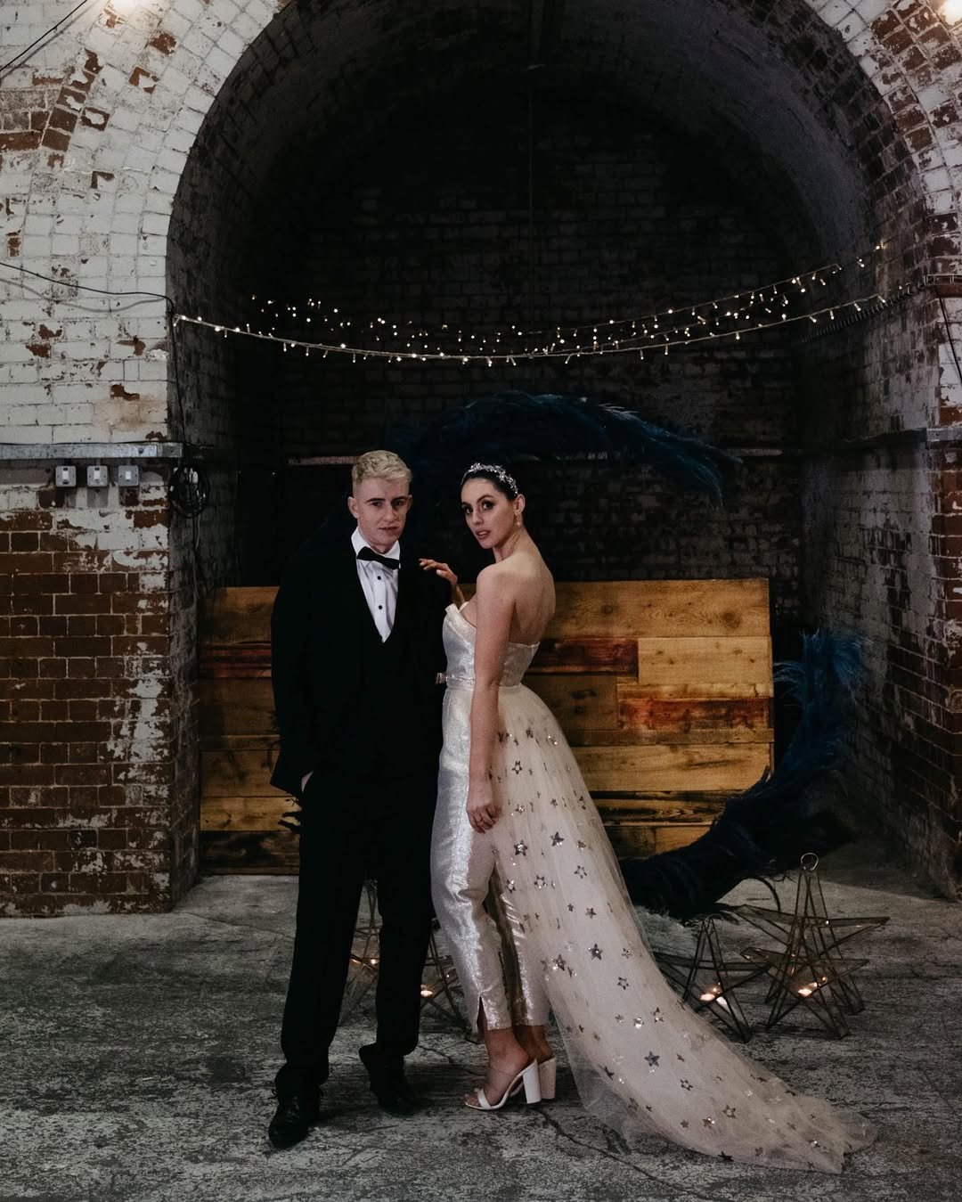 Under the glow of string lights and arched brick ceilings, this modern couple served serious edge and elegance. Her star-dappled tulle train added a dreamy contrast to the raw, industrial venue — like stardust scattered over concrete.