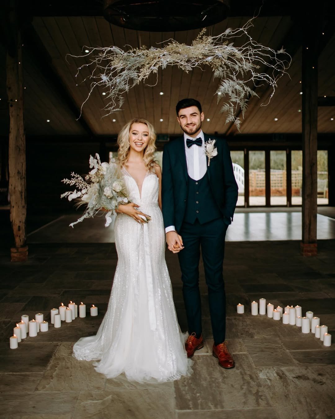 Her sparkled gown glows against the groom’s dapper navy suit, and the airy bouquet of dried botanicals adds a chic, textural touch. It’s an intimate, magical moment — quiet yet utterly captivating.
