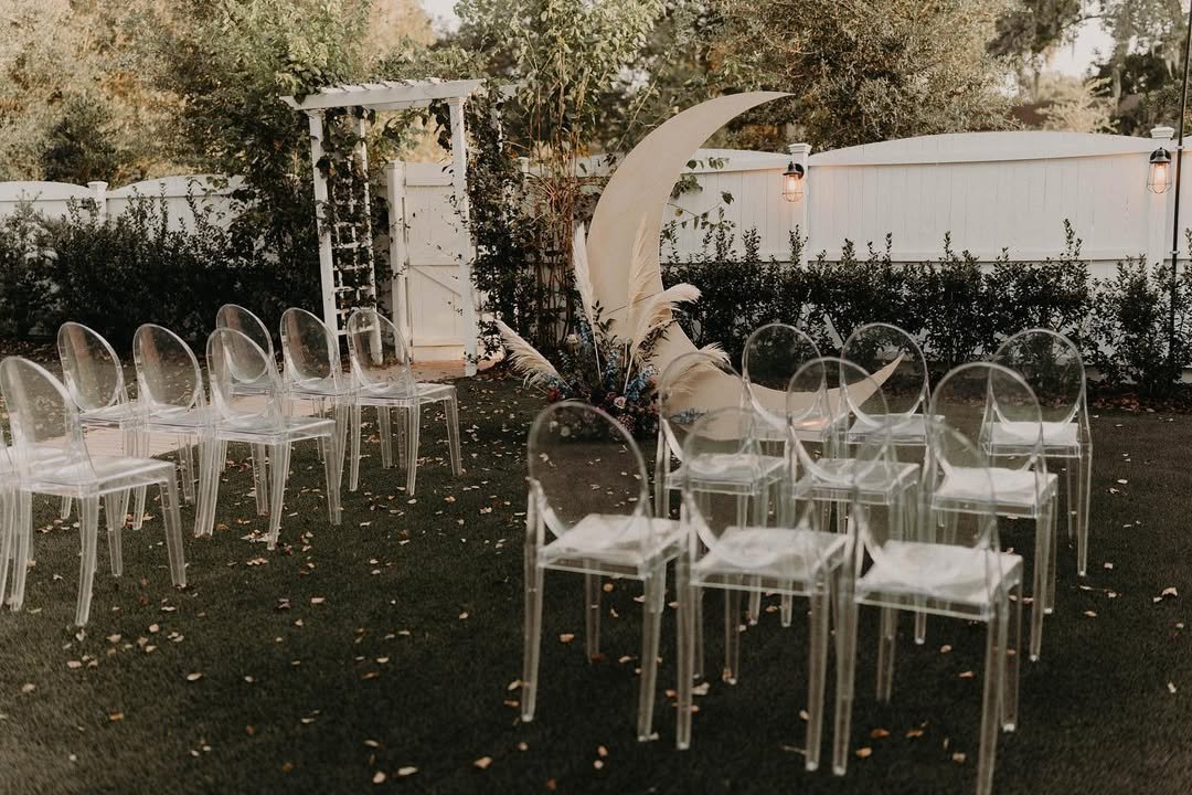 This intimate setup blends cosmic whimsy with sleek modernity. Transparent ghost chairs add a minimalist edge, letting the sculptural crescent moon altar take center stage beneath soft garden light.