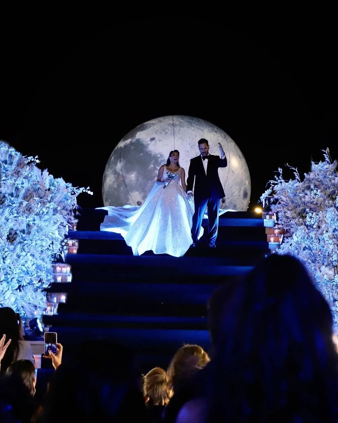 With a glowing full moon as their backdrop, this couple made a celestial entrance straight out of a fairytale. Her glittering gown shimmered like stardust, catching the blue-toned lights as they descended the grand staircase.