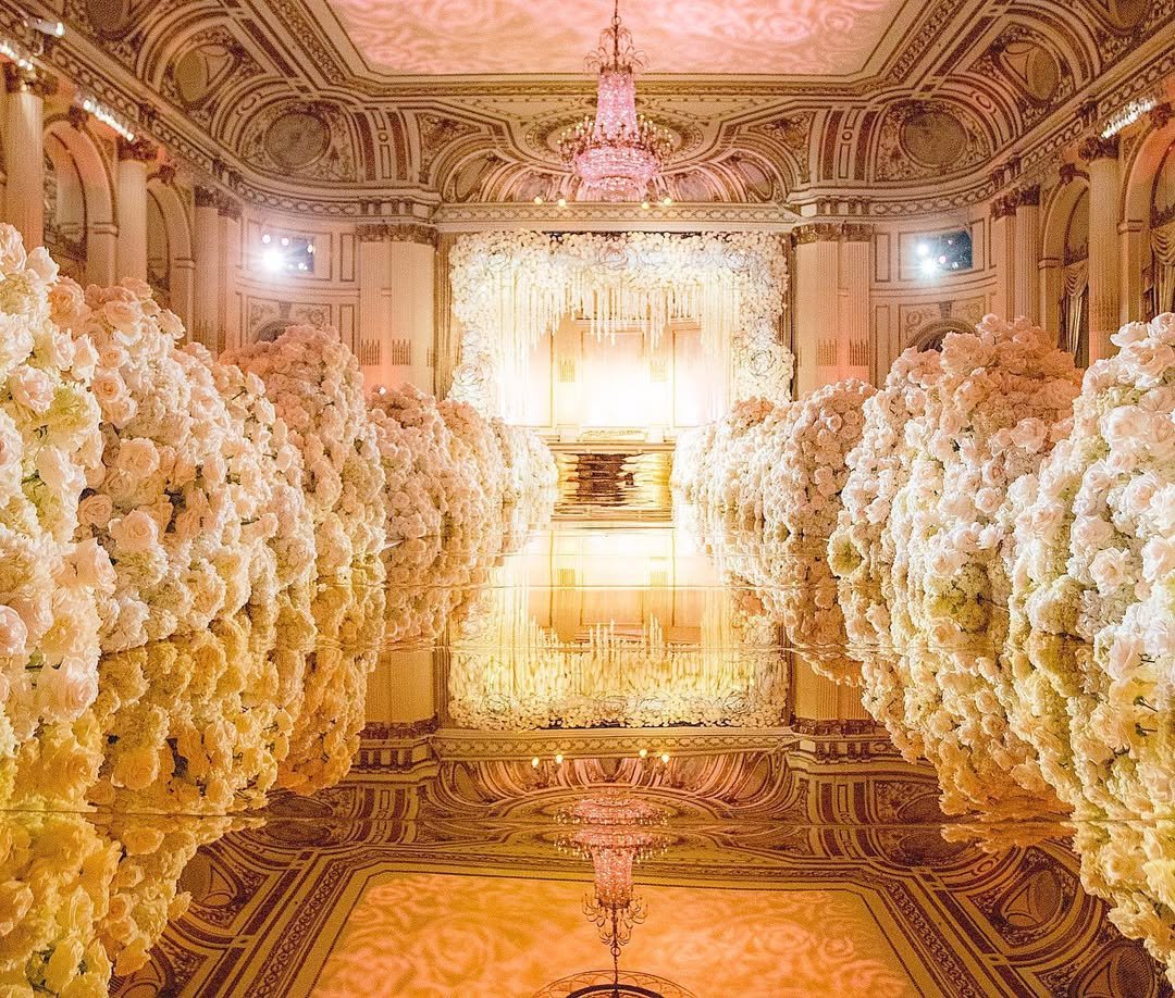 Dripping in grandeur, this floral-drenched aisle feels like a walk through heaven’s ballroom. Billows of ivory roses and hydrangeas line the mirrored floor, reflecting the soft amber glow of chandeliers above.