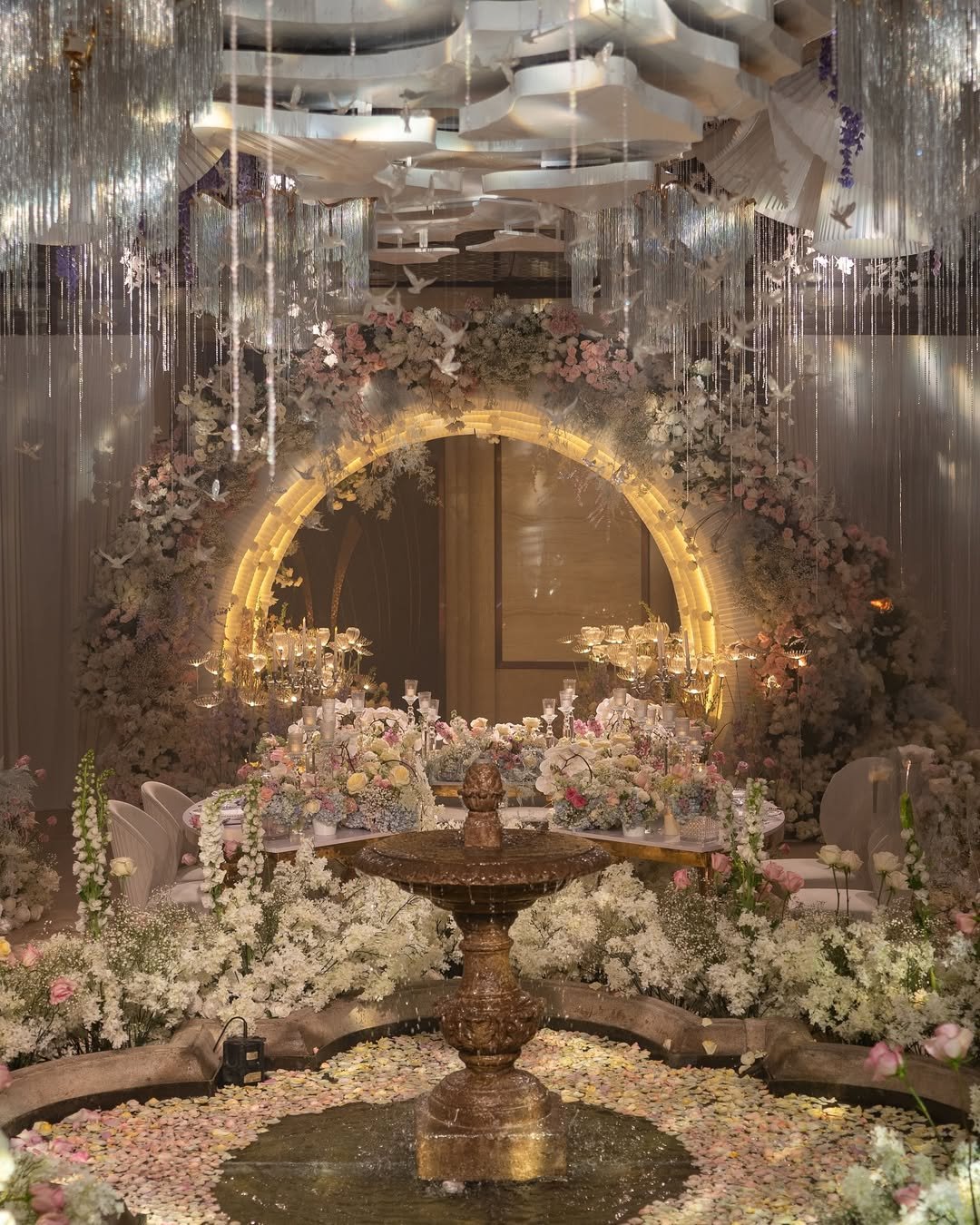 This enchanting setting feels like stepping into a storybook. A golden floral arch frames the intimate dinner table, surrounded by lush clouds of white and pastel blooms. Beneath it all, a stone fountain trickles gently into a bed of rose petals—pure magic.
