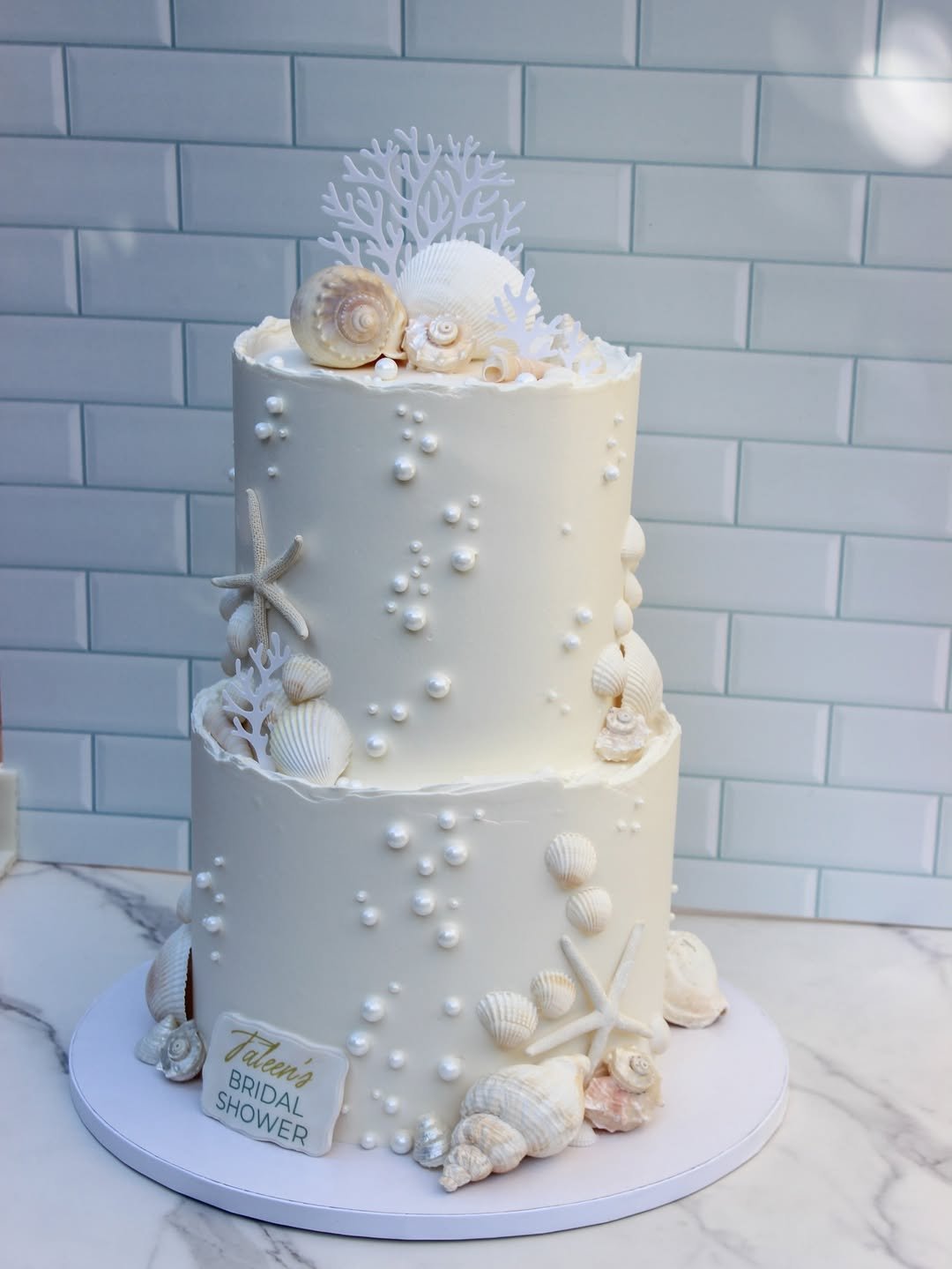 It feels like a bridal shower by the coast or an intimate beach ceremony where everything is dressed in linen and light. I love how the texture does the talking here. No bold colors needed, just layers of shell detail and that soft satin frosting finish.