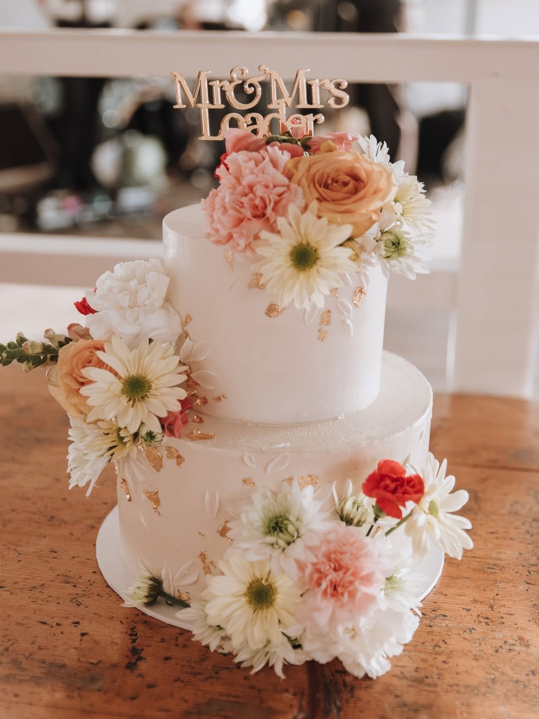Fresh florals cascade across smooth white tiers, blending peach roses and daisies with flecks of gold leaf. The “Mr & Mrs” topper gives it that celebratory glow, but it’s the flowers that make this feel alive and sun-kissed.