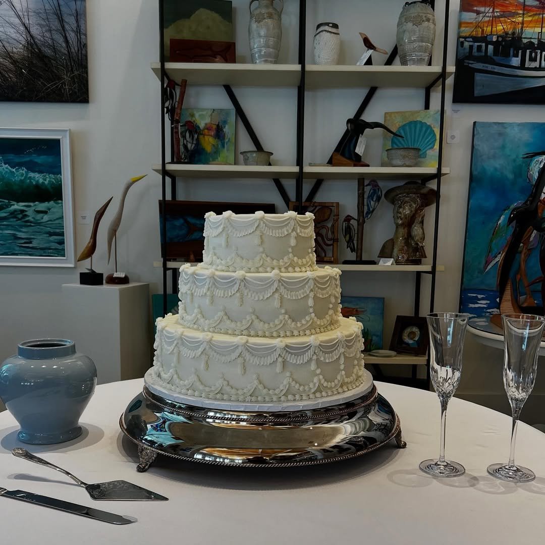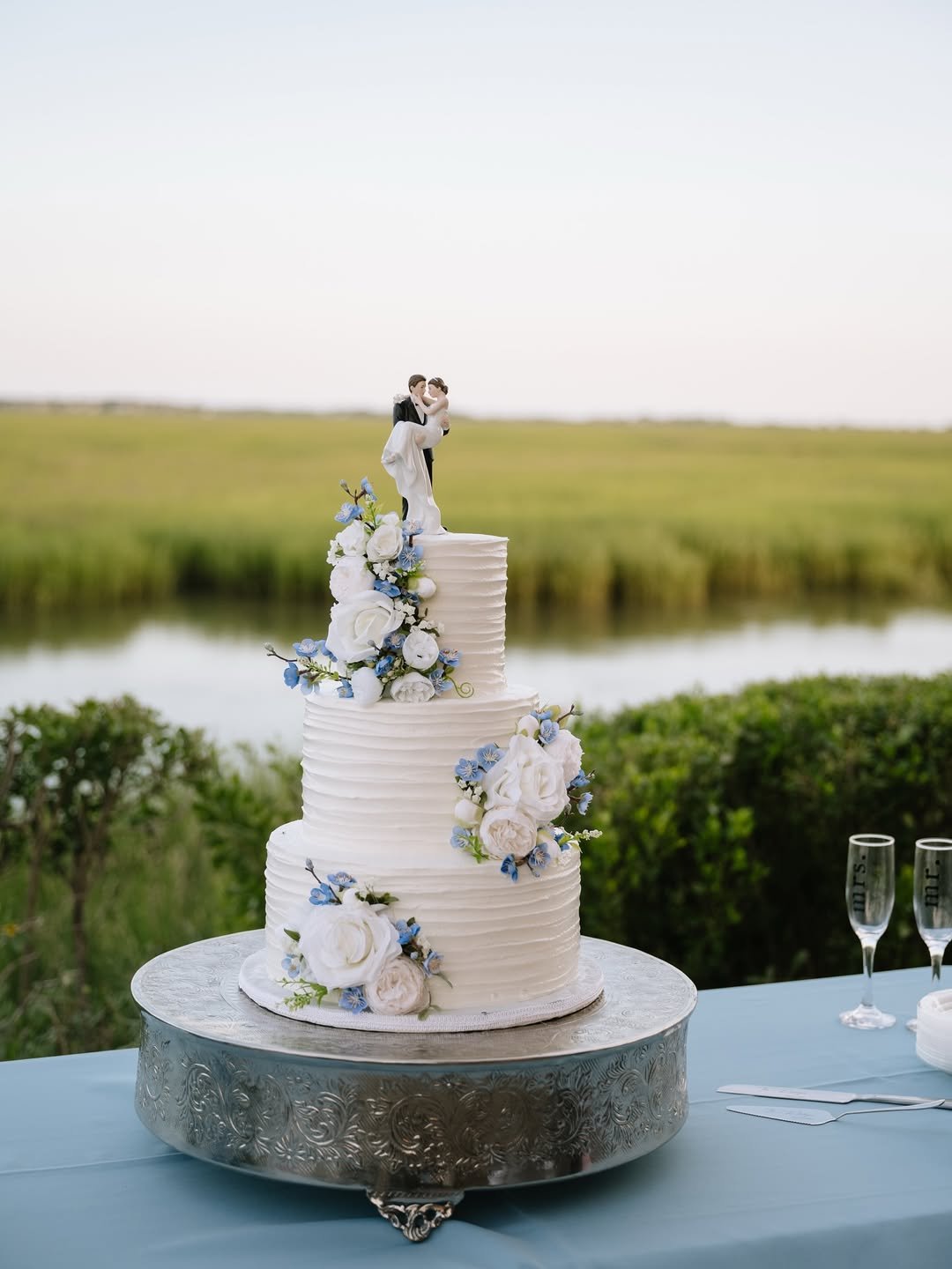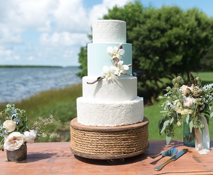 Three tiers wrapped in ornate piping and draped fondant swags bring a touch of old-world romance to the shore. Sitting atop a silver stand, it feels almost heirloom-inspired, like something you would find in a grand seaside estate.