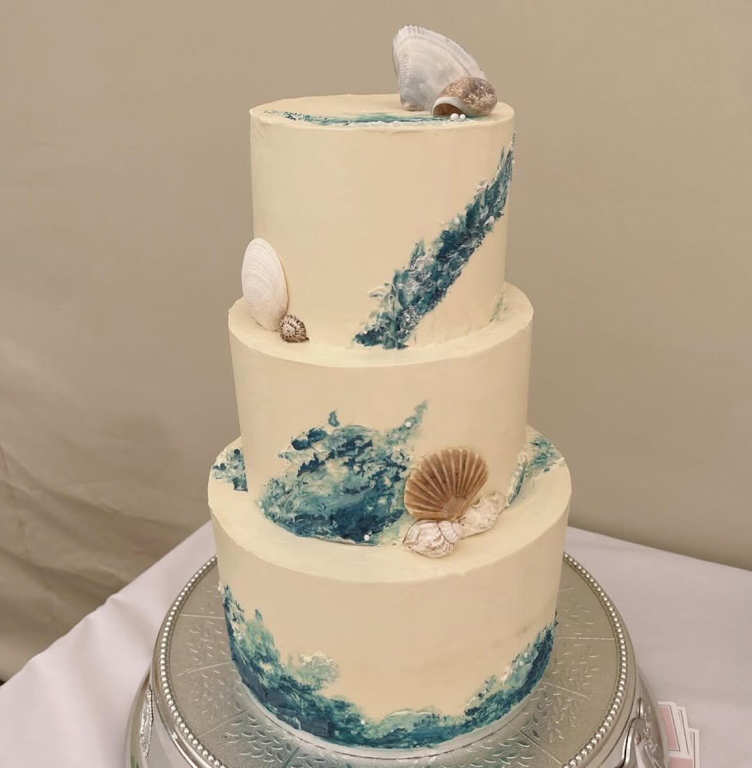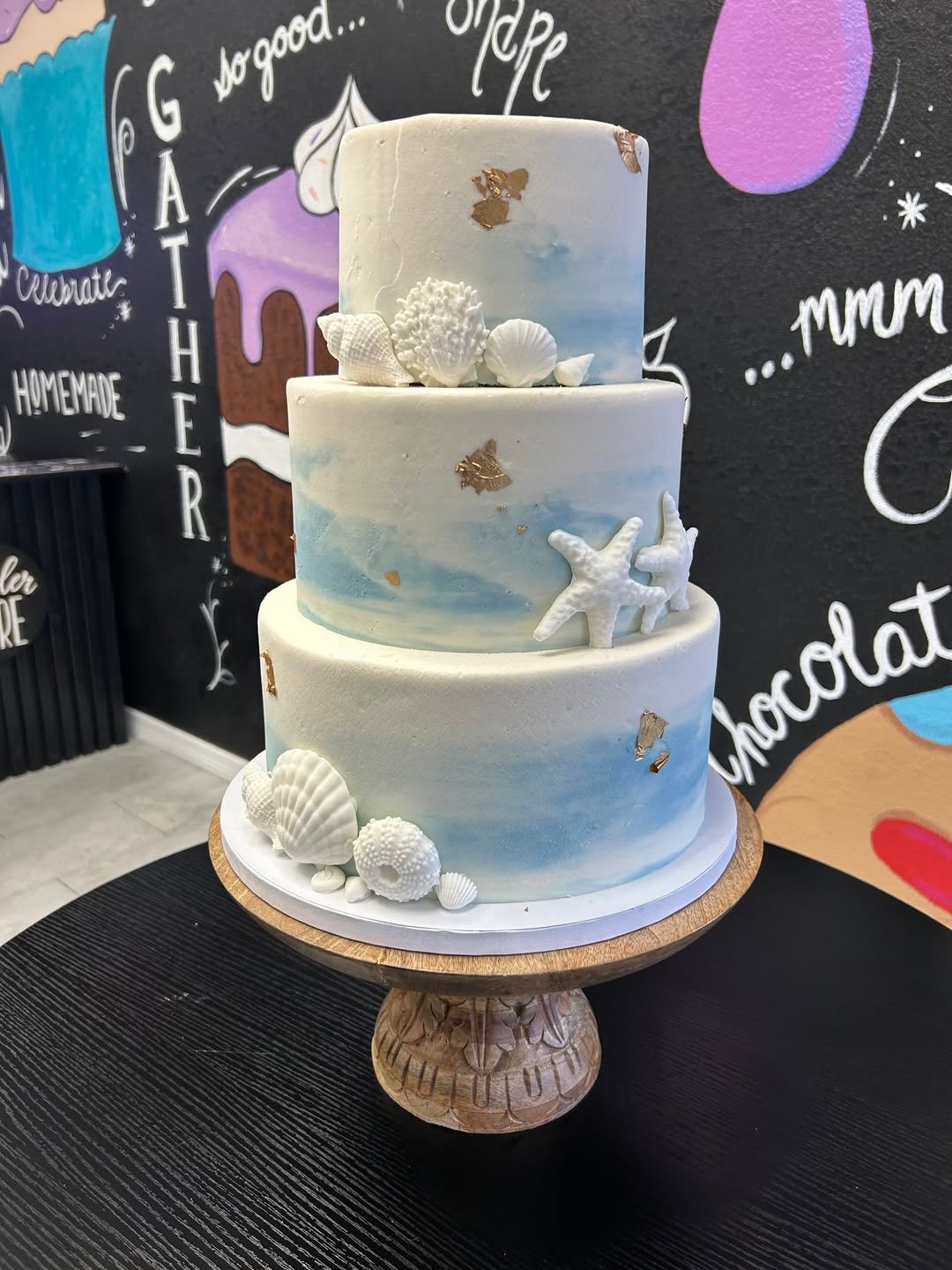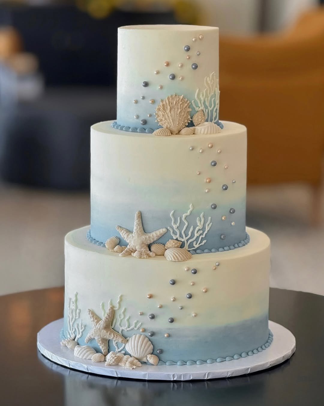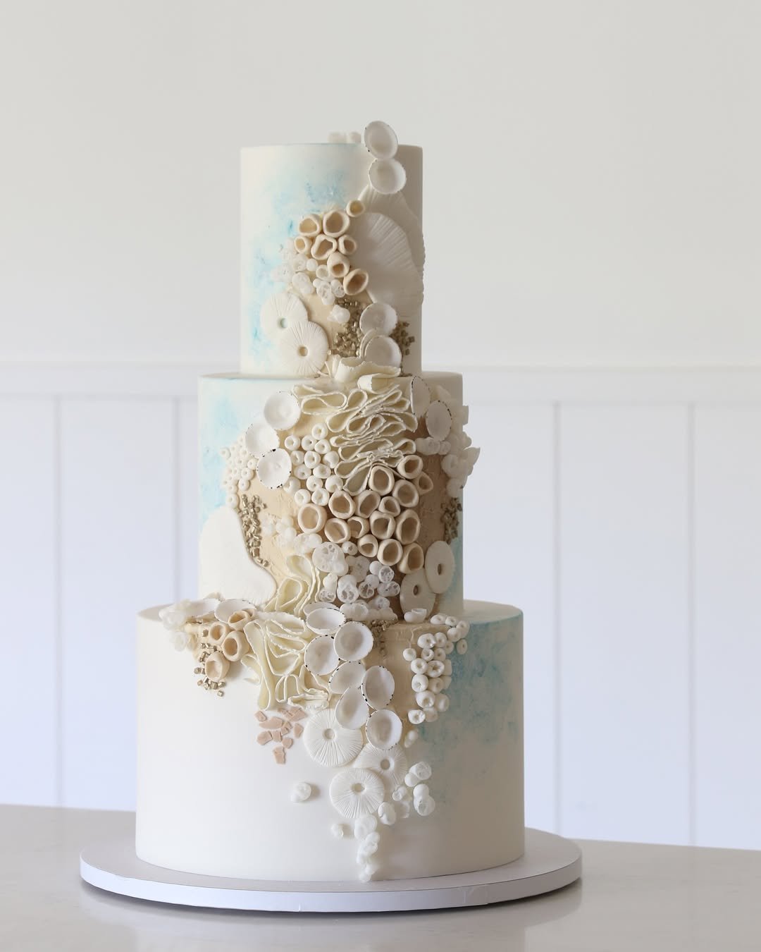 A coastal wedding cake should feel as dreamy as the shoreline itself. Think soft ocean hues, delicate shells, and flowing textures that echo the movement of waves and sea foam.