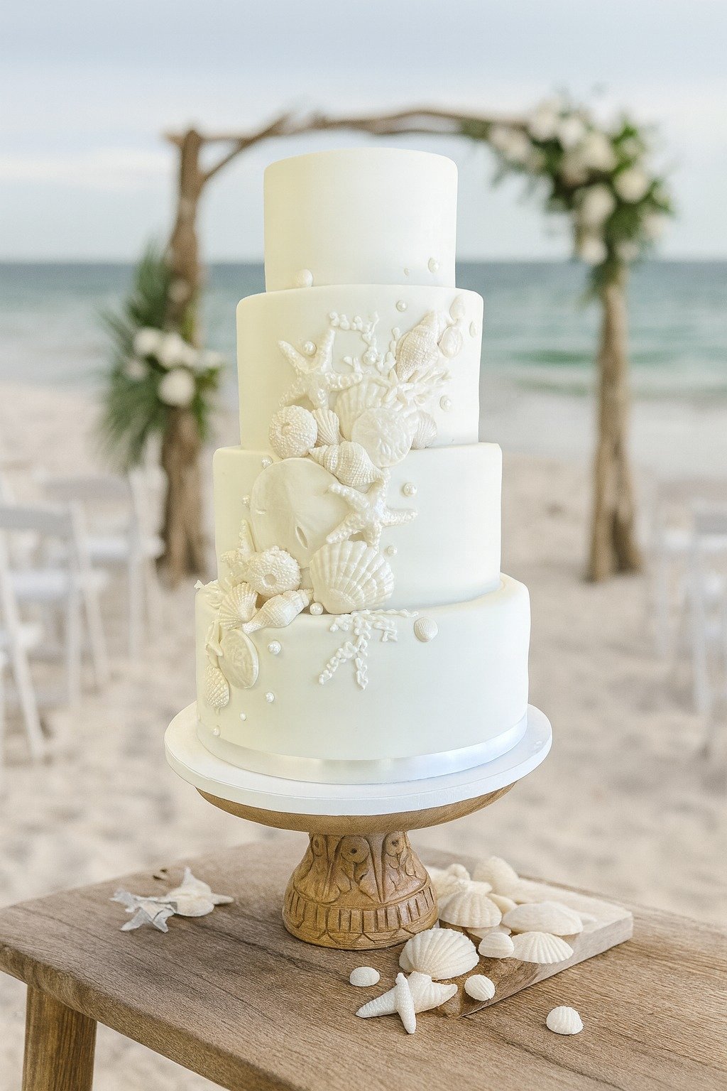 This taller design leans fully into the beach theme with sculpted shells, sand dollars, and textured fondant arranged in a vertical cascade. The all-white finish keeps it bridal and clean.