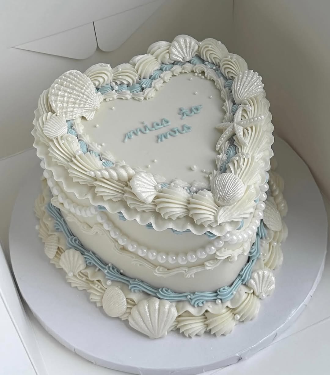 A heart-shaped cake trimmed with piped shells, pearls, and soft blue accents brings in a touch of vintage charm. The delicate script in the center makes it feel personal and intimate.
