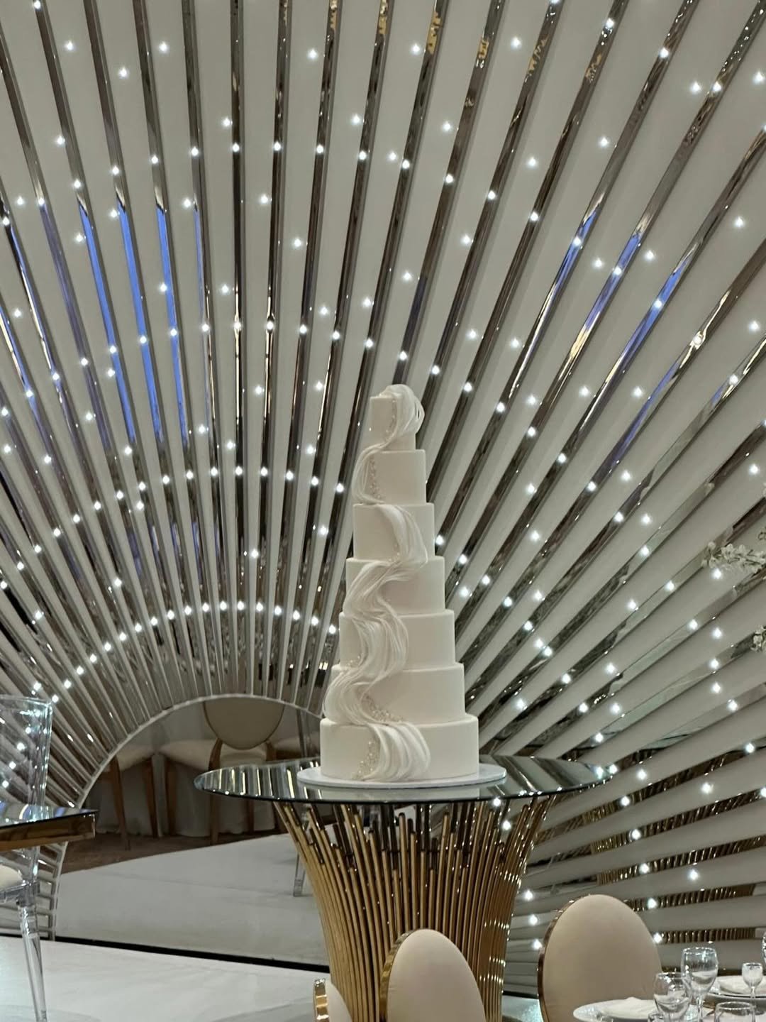 Now this is a statement. Tall, architectural, and impossibly sleek, this towering beauty commands the room before you even step onto the dance floor. The cascading sugar swirls feel sculptural, almost couture, like fabric frozen mid-motion.