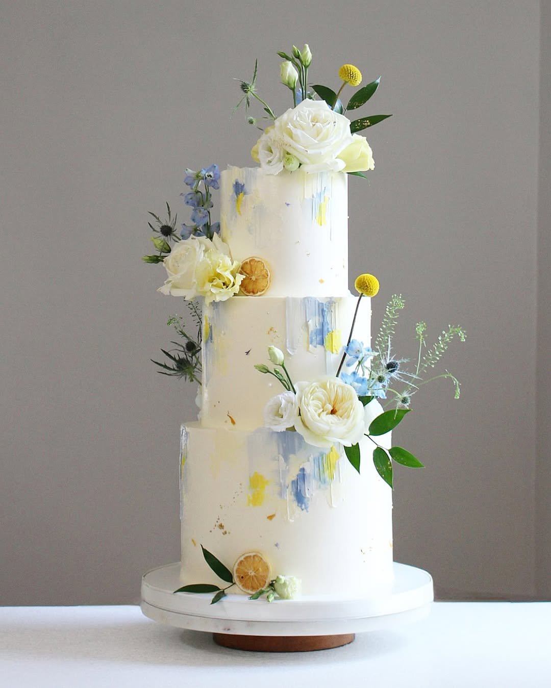 Soft brushstrokes in muted blue and butter yellow give this cake an artful, almost editorial edge. It feels like spring captured in frosting. Fresh blooms and citrus slices add a garden-fresh energy that makes the whole design feel alive.