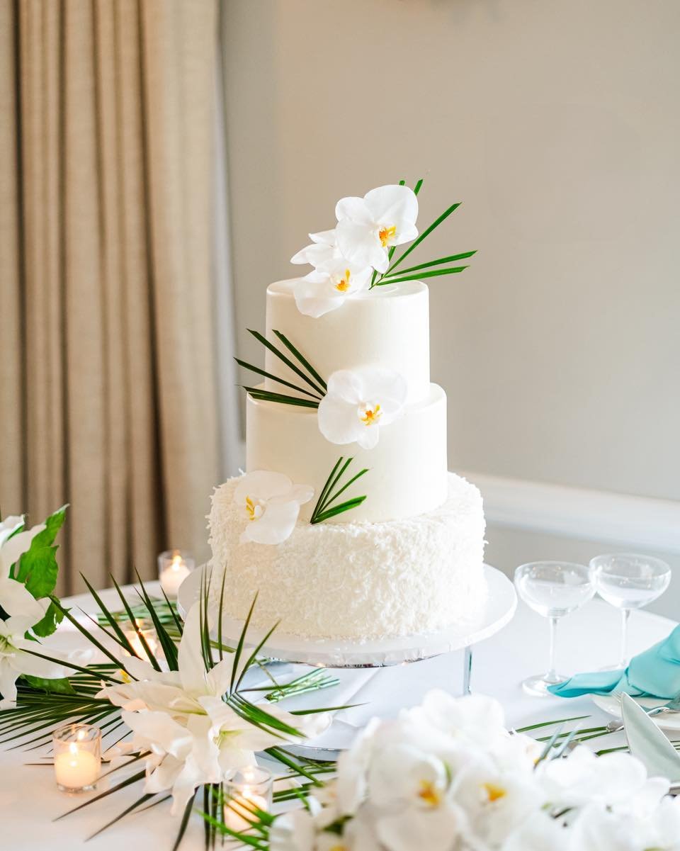 Clean tiers, crisp white orchids, and sharp green palm leaves create a look that’s both minimal and lush. The textured base tier adds contrast, almost like a soft fringe against the smooth upper layers.