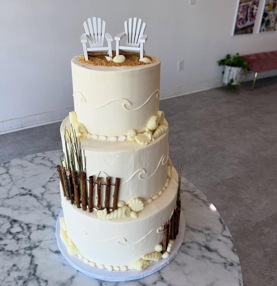It’s romantic in the sweetest way. Almost like a love note written in frosting, framed by seashells and seafoam swirls. For a coastal couple who wants their cake to feel as tender as the vows themselves, this one truly steals the show.