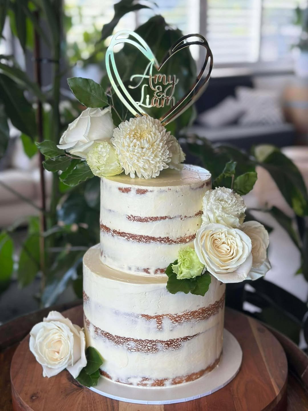 Semi-naked tiers reveal just enough cake beneath silky frosting, giving this design a relaxed, intimate mood. White roses and soft green blooms bring in romance, while the acrylic topper adds a modern touch.