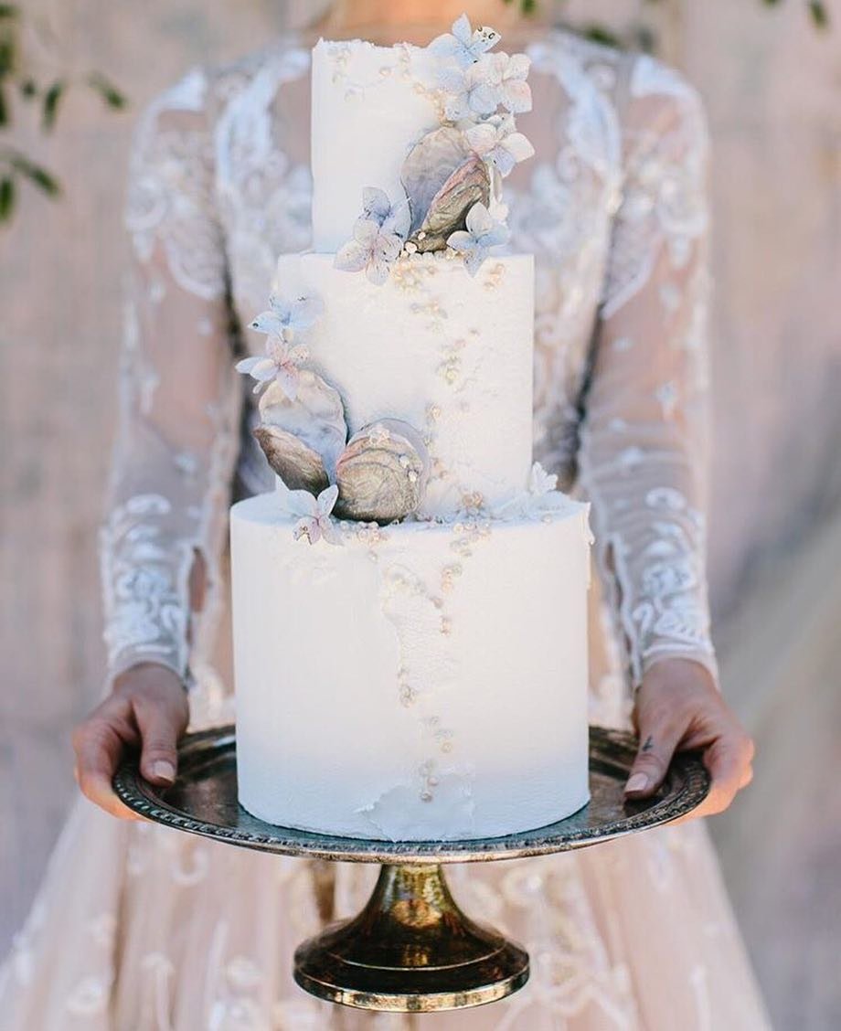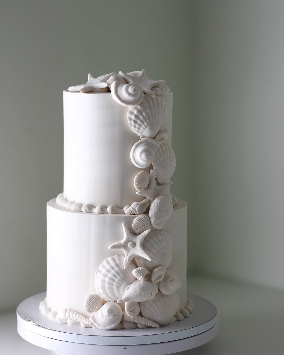 There’s something so sculptural about this one. Smooth white tiers become a canvas for cascading shells and starfish, each detail placed like a little treasure collected at low tide. It feels serene and refined, almost gallery-like, with that all-white palette letting texture do all the talking.