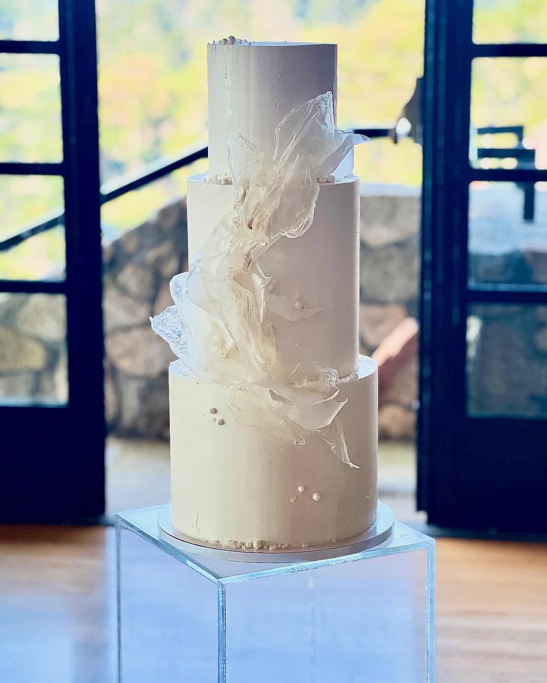 This design feels like it’s wrapped in the softest whisper of fabric. The tiers are clean and minimal, then suddenly you see that delicate, almost wind-swept sugar detail flowing down the side. It’s romantic, but not fussy.