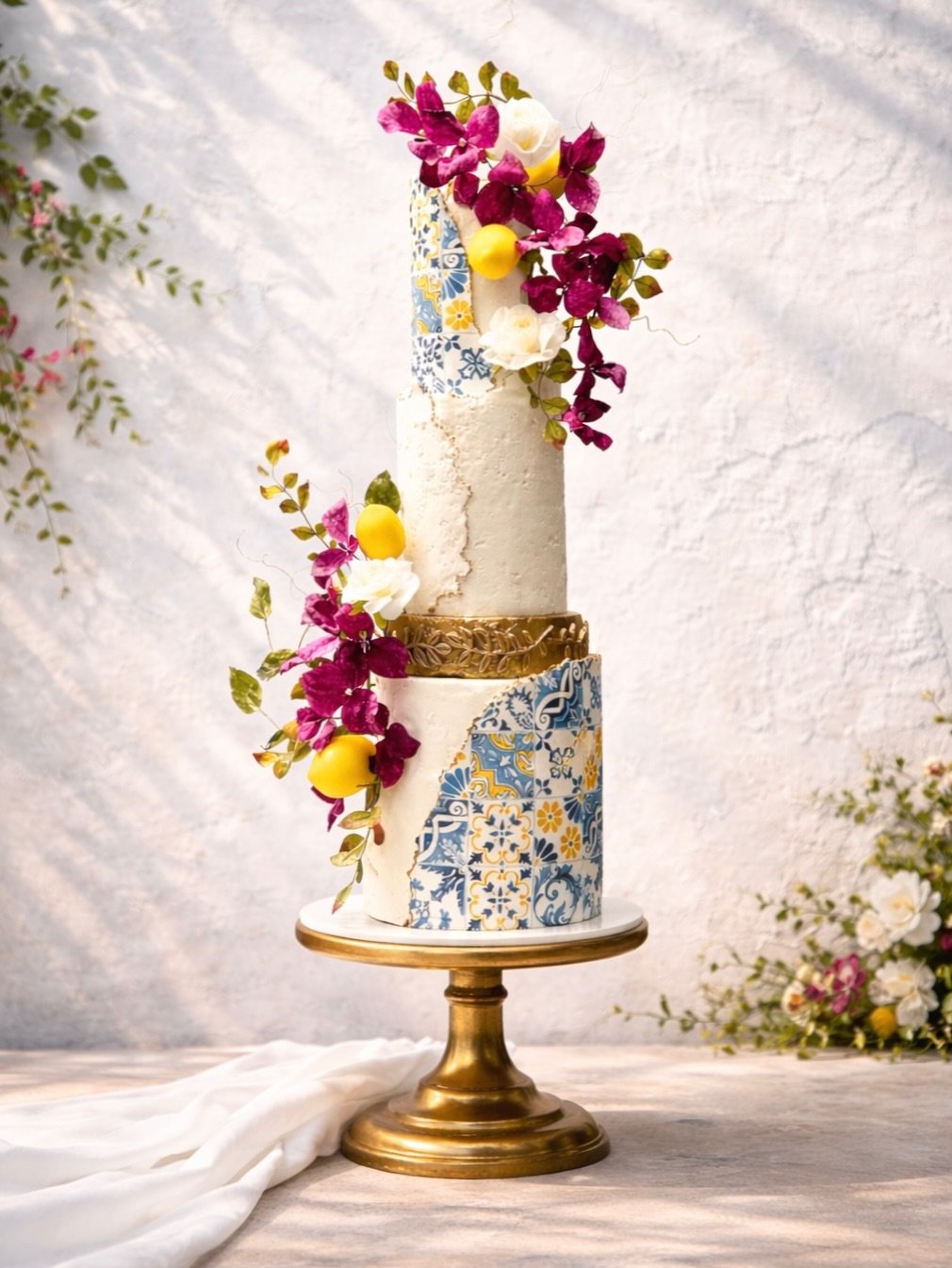 Now this is a celebration. Blue and white tile-inspired panels wrap around the tiers, paired with bursts of bougainvillea and bright lemons. It feels like a summer evening on the Amalfi Coast, long tables, clinking glasses, golden light.