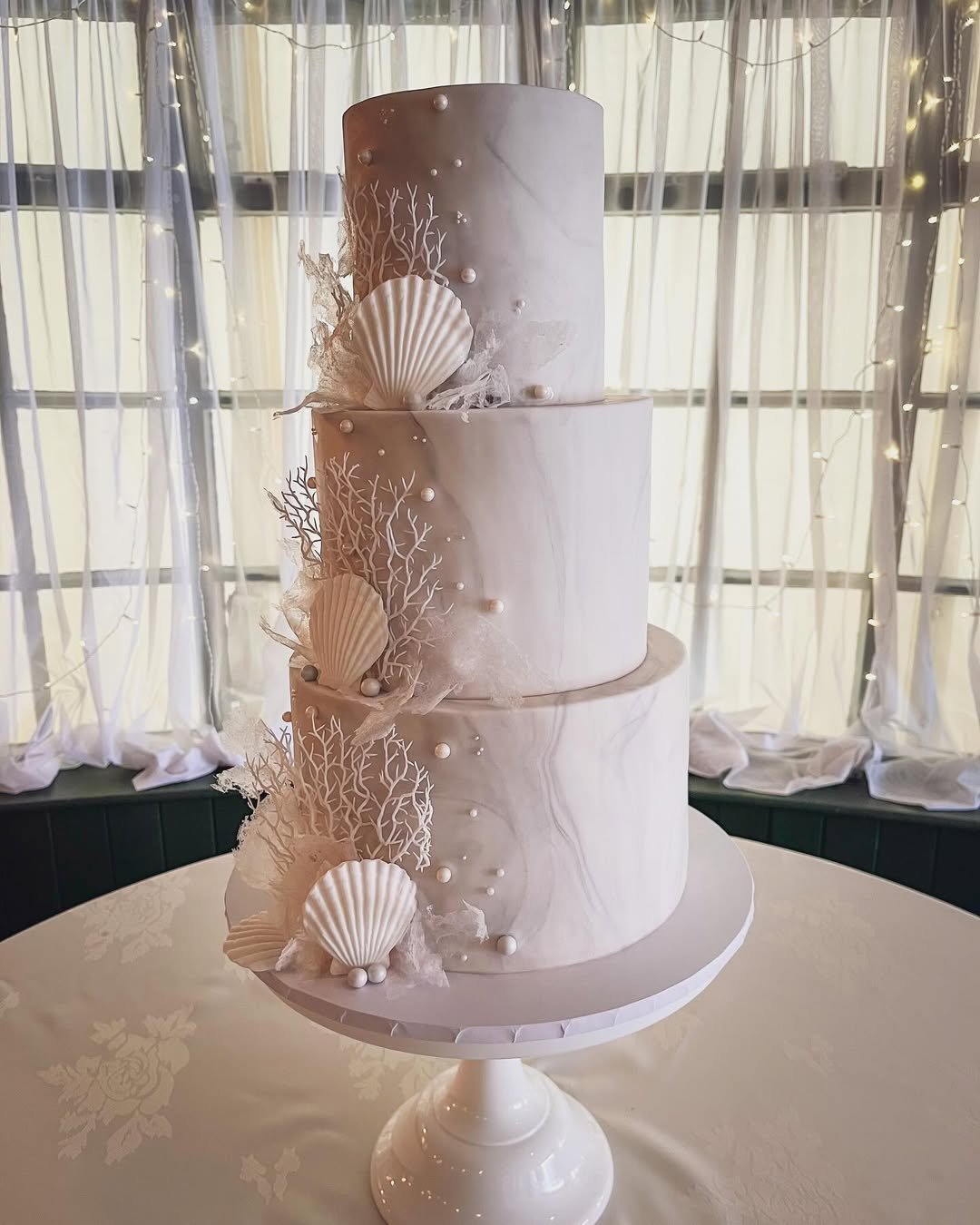 There’s something about this cake that feels like it belongs at a sun-drenched coastal estate. The piped buttercream swirls ripple like soft waves, wrapping each tier in movement and texture while delicate shells and pearl accents catch the light. It’s monochrome, yes, but far from simple. The dimension does all the talking.