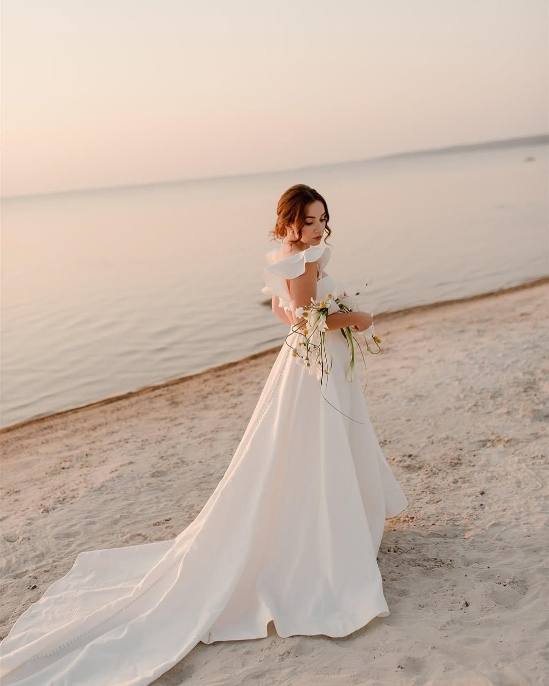 Soft light, calm water, and a gown that moves like a quiet sigh. The clean lines and gentle ruffle sleeves give this dress a refined softness that feels intentional rather than ornate. It’s minimal, but not plain.