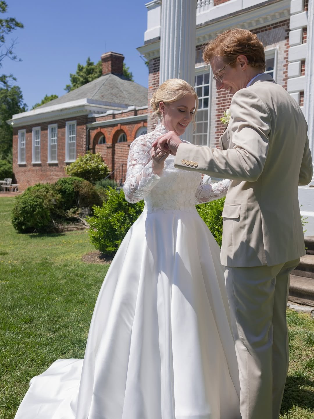 High neckline, long lace sleeves, and a full satin skirt that catches the light just right. This look nods to tradition in the most elegant way. Set against a stately brick estate, it feels almost regal, like stepping into a modern fairytale with roots in the past.