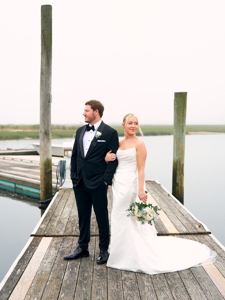 A wooden pier, still water, and a tux that fits like it was tailored that morning. This moment feels timeless in a way that photographs beautifully for decades. Her structured strapless gown with a subtle train pairs effortlessly with his classic black bow tie. It’s crisp, composed, and undeniably polished.