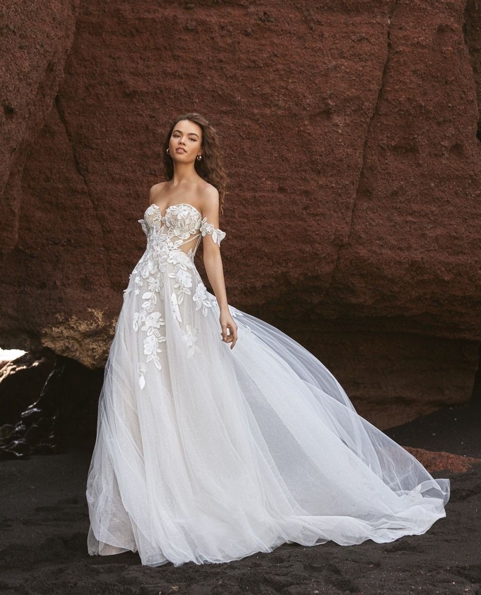 This gown feels like it belongs in a storybook. Layers of airy tulle spill into a dramatic train, while floral appliqué blooms across the bodice and off-shoulder sleeves. Set against deep rust cliffs, the softness of the dress becomes even more striking.