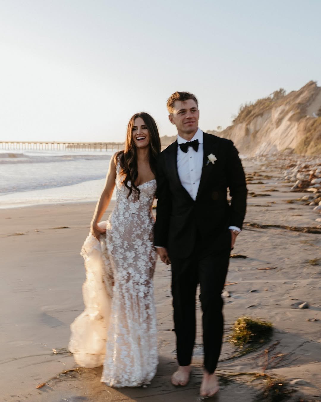 Golden hour on the beach and a gown that sparkles without stealing the spotlight from the horizon. The fitted silhouette, floral appliqué, and soft illusion details create that signature couture drama, but it still feels effortless as they walk barefoot along the shore.