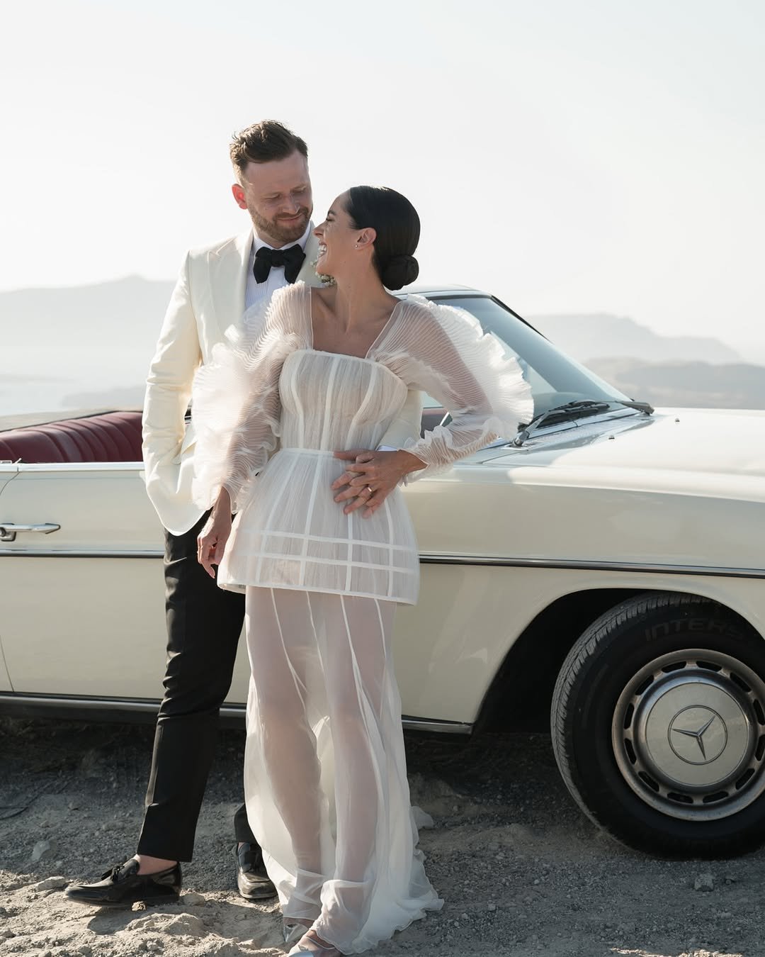 This look leans into modern bridal with confidence. The structured mini layered over sheer fabric feels bold yet refined, especially styled against that vintage car backdrop. There’s a playful tension between the tailored groom and the bride’s airy silhouette that makes the whole moment feel editorial.