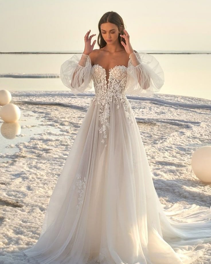 Billowy tulle sleeves, structured bodice, and cascading appliqué create a silhouette that feels almost storybook. Set against pale sand and sculptural décor, the gown becomes part of the landscape.