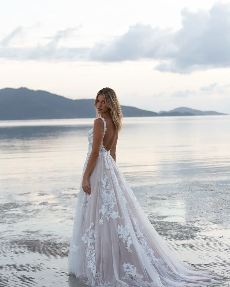 For brides who want that princess energy without losing coastal lightness, this is it. The airy fabric keeps it beach-appropriate, while the detailed bodice brings that elevated, couture feel. It’s romance, reimagined for the shore.