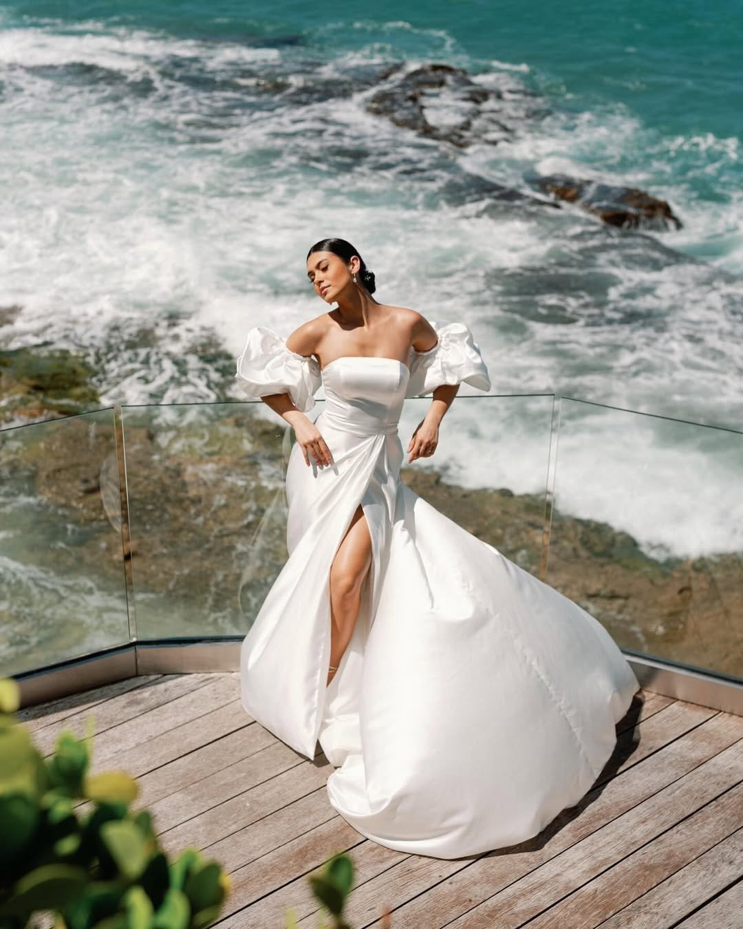 Now this is drama in the best way. Off-the-shoulder puff sleeves paired with a sleek skirt and high slit create that bold, wind-ready silhouette that looks incredible against crashing waves. The fabric moves, the ocean roars, and suddenly it’s a full fashion moment.