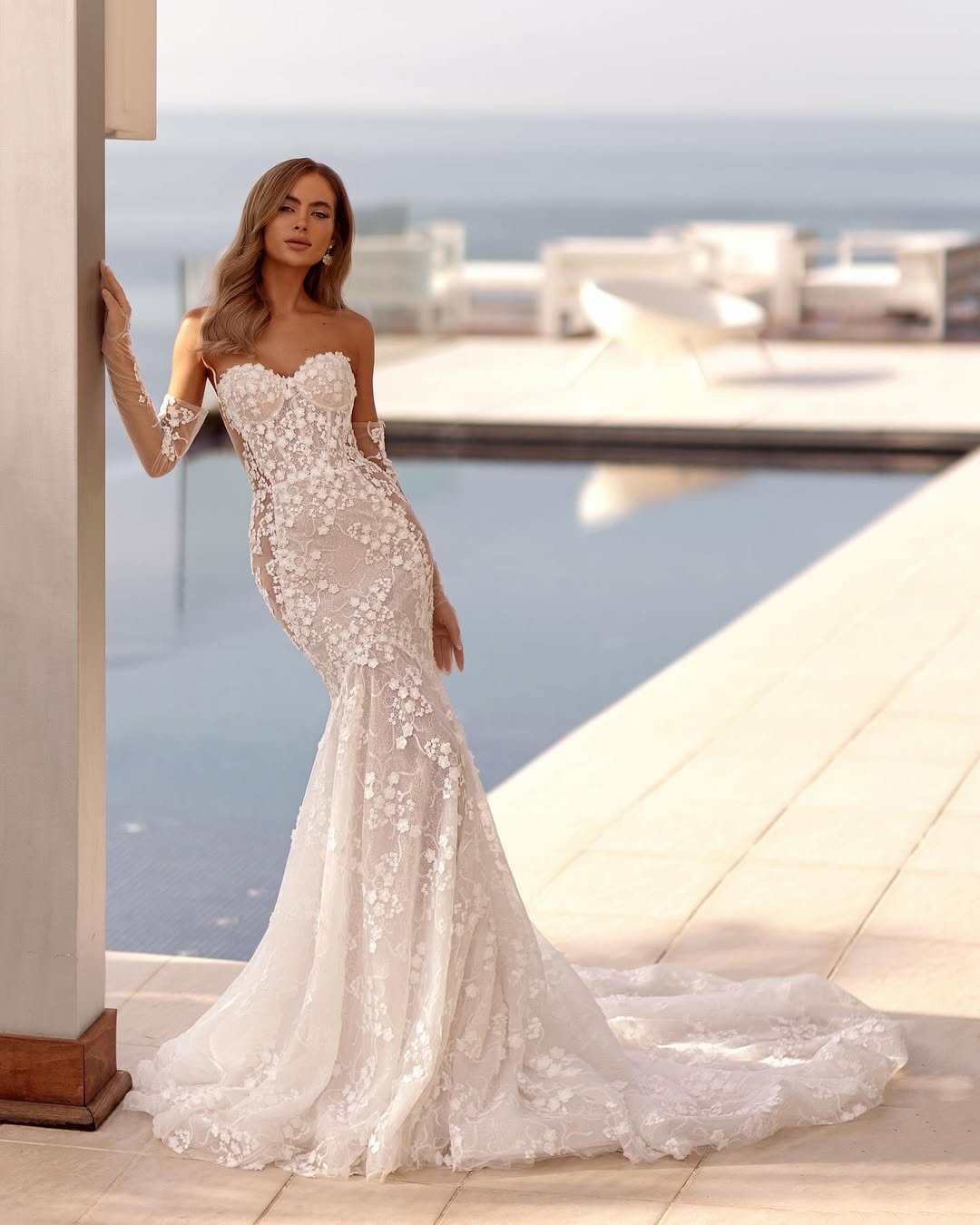 A fitted lace gown with long illusion gloves brings a touch of old-Hollywood glamour to the coast. The intricate detailing hugs every curve, while the train pools softly across sun-warmed tiles overlooking the water.