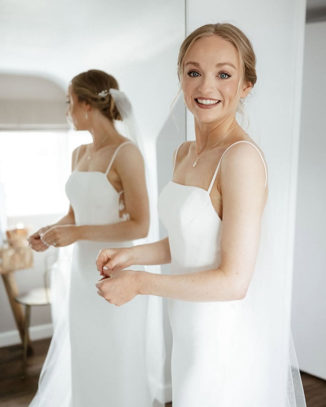 A slim silhouette with delicate straps brings a modern softness to a coastal celebration, even if you’re getting ready inside. The gown’s clean lines and subtle structure feel refined, almost architectural, yet still light enough for a beachside ceremony.