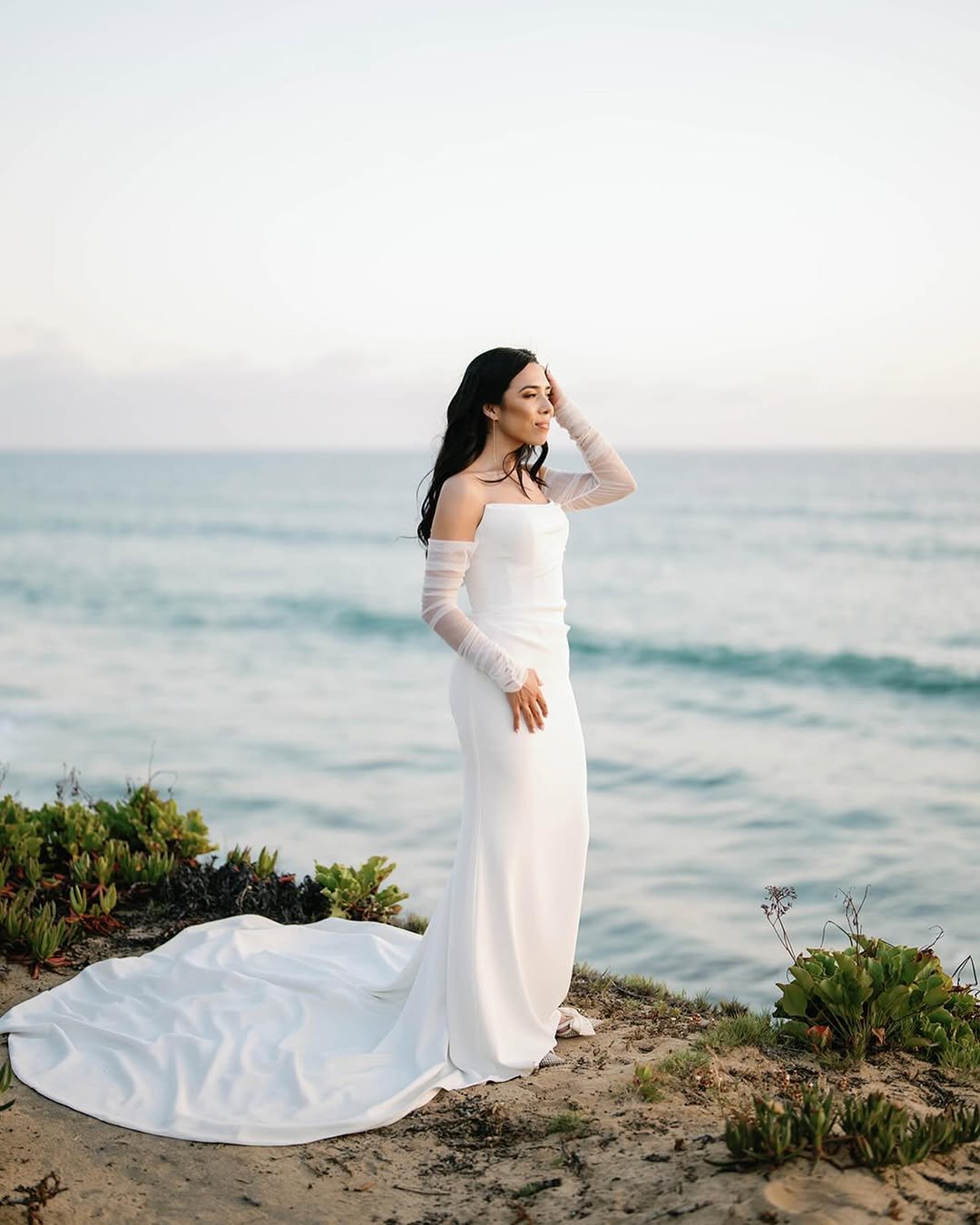 I adore how effortless it feels. No heavy embellishment, no competing details, just silk, sun, and shoreline. If you’re planning vows with the ocean as your backdrop, this kind of simplicity lets the setting do the talking while you glow right at the center of it.