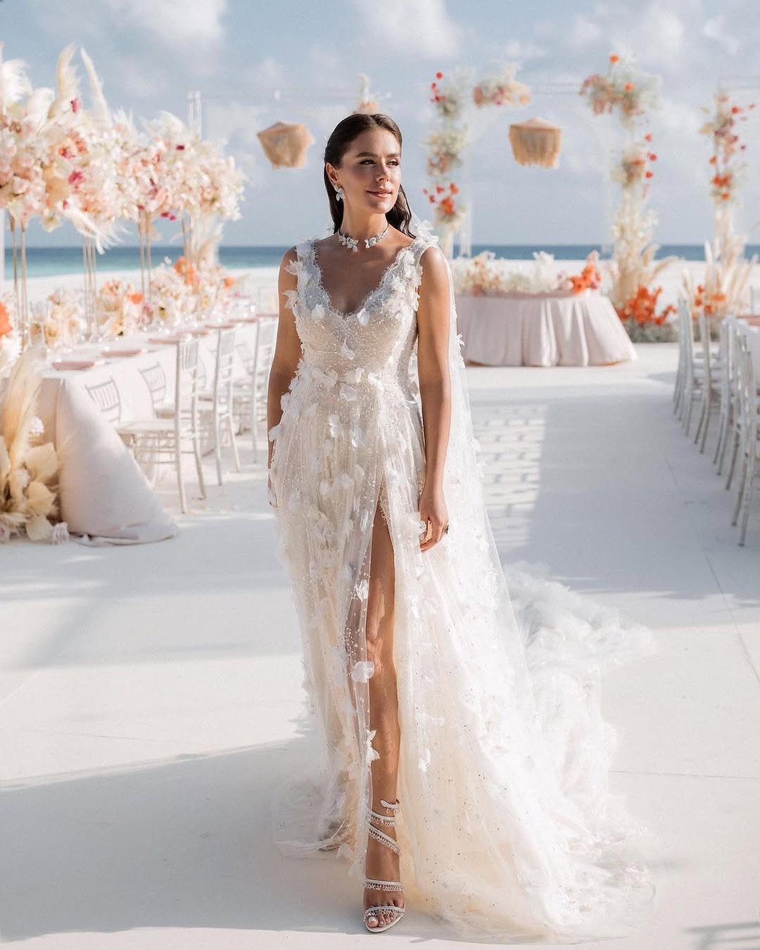 There’s texture, there’s lightness, there’s movement. It’s the kind of dress that catches golden hour in the most flattering way. If you’re dreaming of a styled beach reception that feels editorial but warm, this look is pure inspiration.