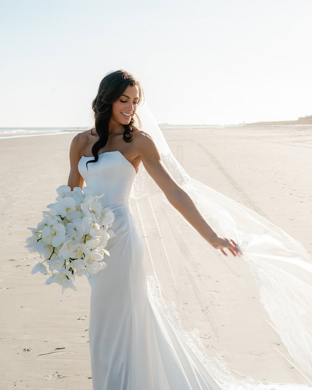 There’s something about a strapless satin gown on an open stretch of sand that just feels cinematic. The clean neckline, the way the fabric skims the body, that long veil catching the sea breeze, it’s understated but unforgettable. Paired with a bouquet of crisp white orchids, this look leans into that barefoot-luxury mood coastal brides love.
