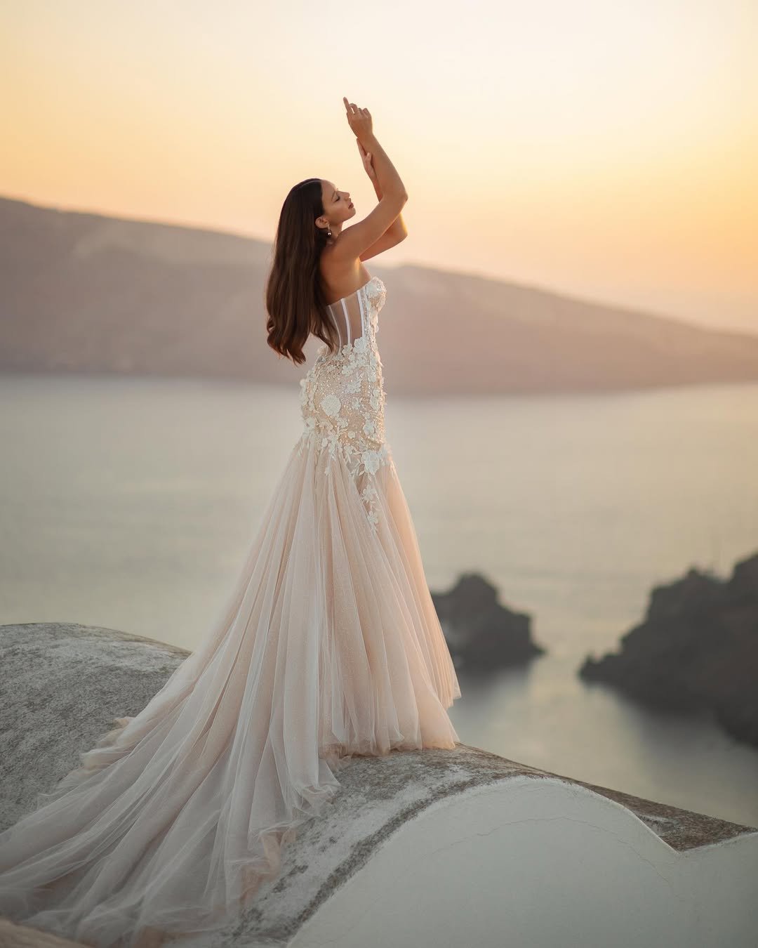 Here, the blush undertone softens the classic bridal palette just enough to feel fresh. The corset-style bodice paired with cascading tulle creates a silhouette that’s both structured and dreamy, especially set against that golden horizon.