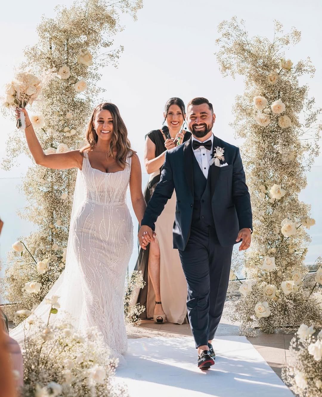 Clean lines, delicate embroidery, and a fitted silhouette create a gown that feels both traditional and fresh. Walking hand in hand beneath arches of ivory blooms, this bride embodies modern romance.